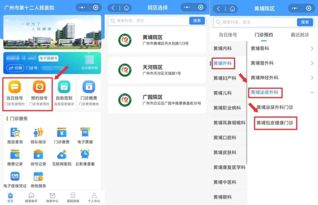 微信公众号预约:关注“广州市第十二人民医院”服务号→就医服务→当日挂号/预约挂号→天河院区/黄埔院区→外科→泌尿外科→包皮健康门诊